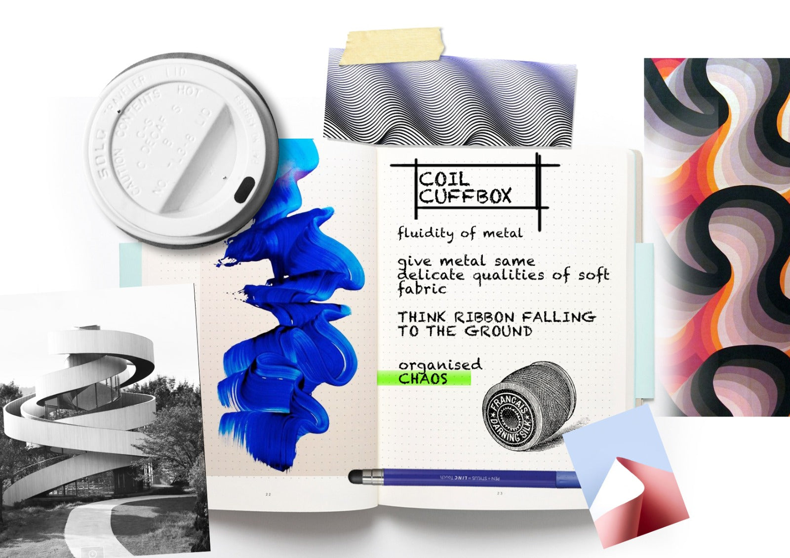 Five overlapping brushed gold and silver plated bracelets give the Coil Cuffbox clutch its impactful design. The structural clutch is comprised of black lizard print leather on the front and back and matching black scotch grain on the sides.