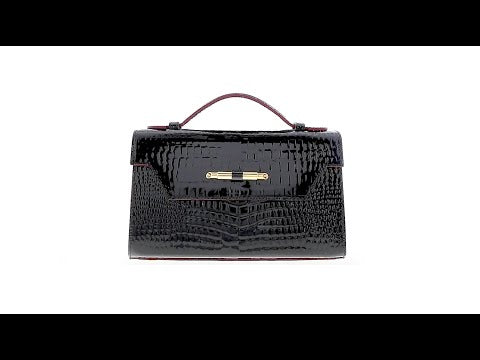 Made from the highest quality calf leather, our Amelie pouch bag is dressed in a beautiful glossy croc print design featuring playful gold plated hardware. Its rectangular shape makes it ideal for holding in all the essentials, while the trusty top handle & the long removable strap help you wear it in various different ways depending on your mood or outfit.